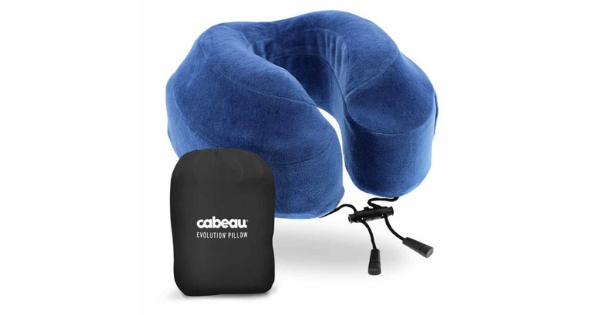 Among memory foam cushions, we seclude another top pick, The Cabeau Evolution. This pad is a memory foam neck pillow with raised back and a thick frame, designed so that it supports your head in every seat or sleeping position, no matter if your head leans to the right, left, or forward. When tightening its drawstrings, it secures a total 360-degree comfort, while cradling your head and neck, and taking the pressure off.